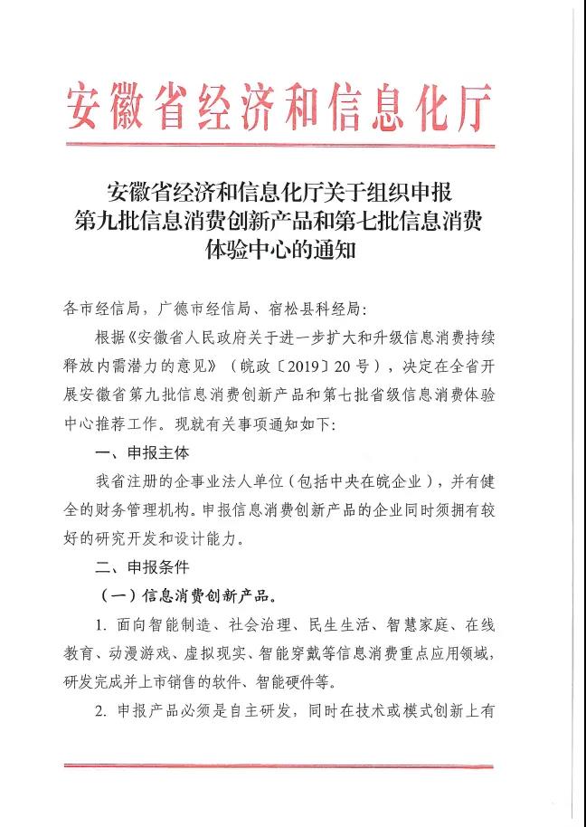 安徽省第九批信息消費創新産品和第七批信息消費體(tǐ)驗中心申報開始
